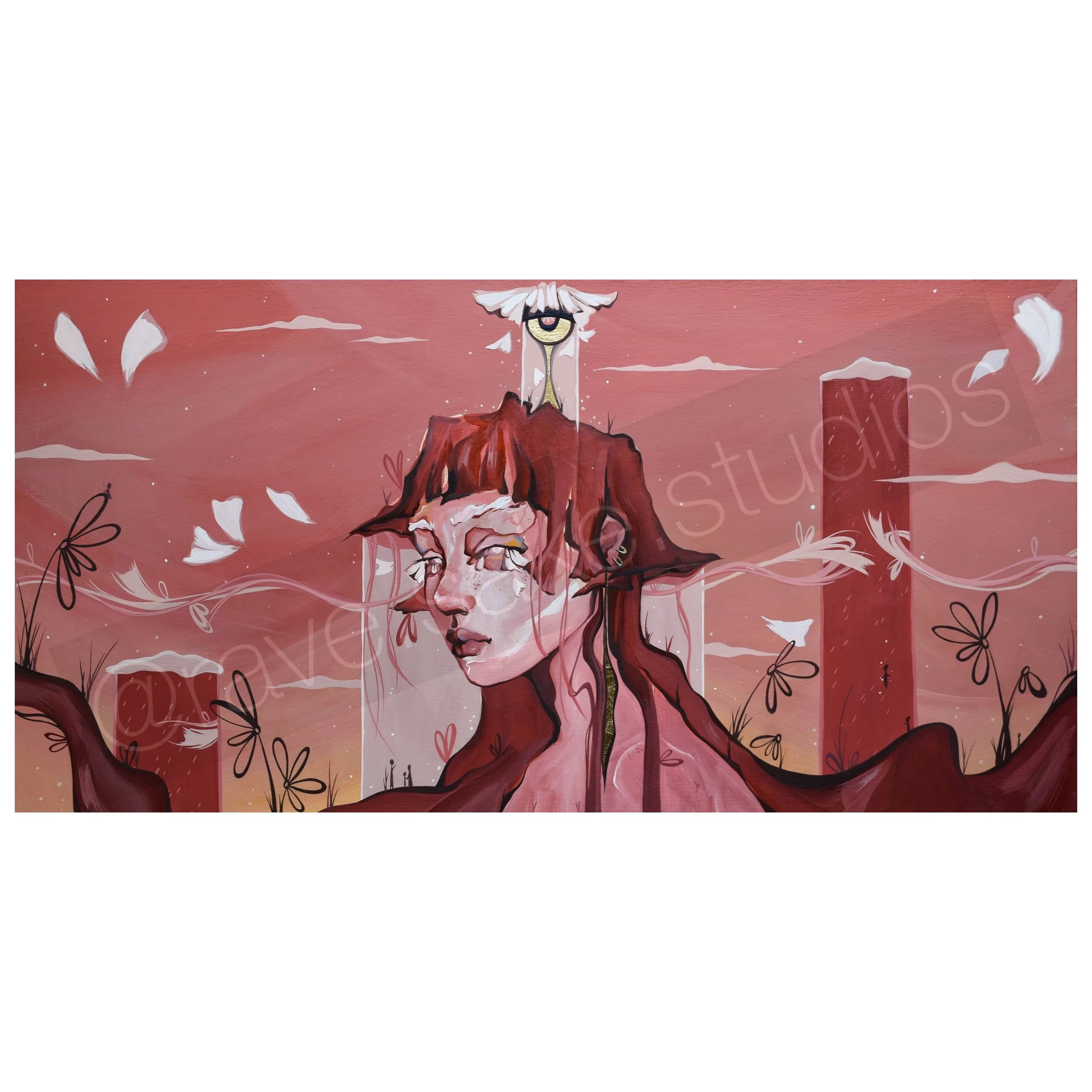 Using the largest canvas I’ve worked to date, (60x40) this was the most difficult and time consuming, yet rewarding piece thus far. Entirely free-handed with acrylics, and given a poetic narrative.