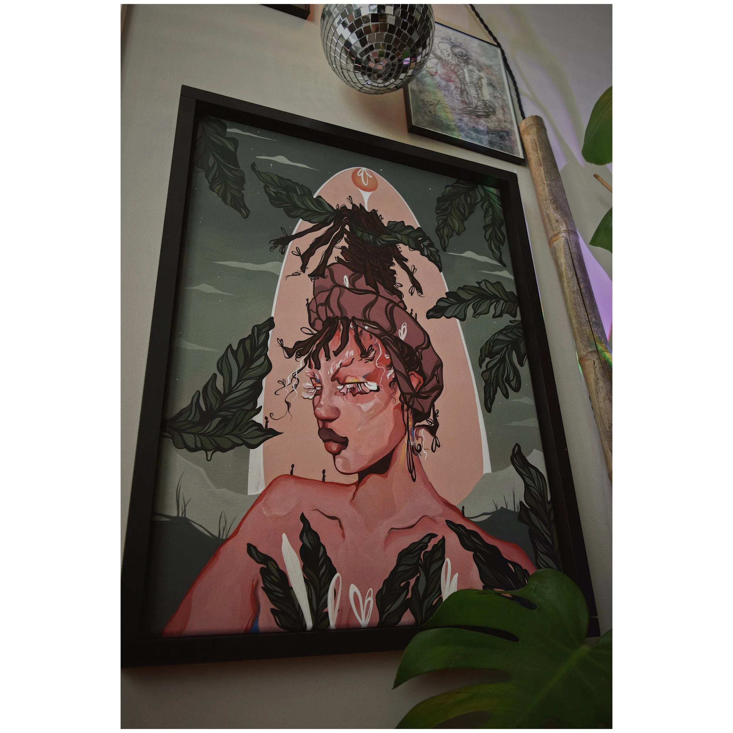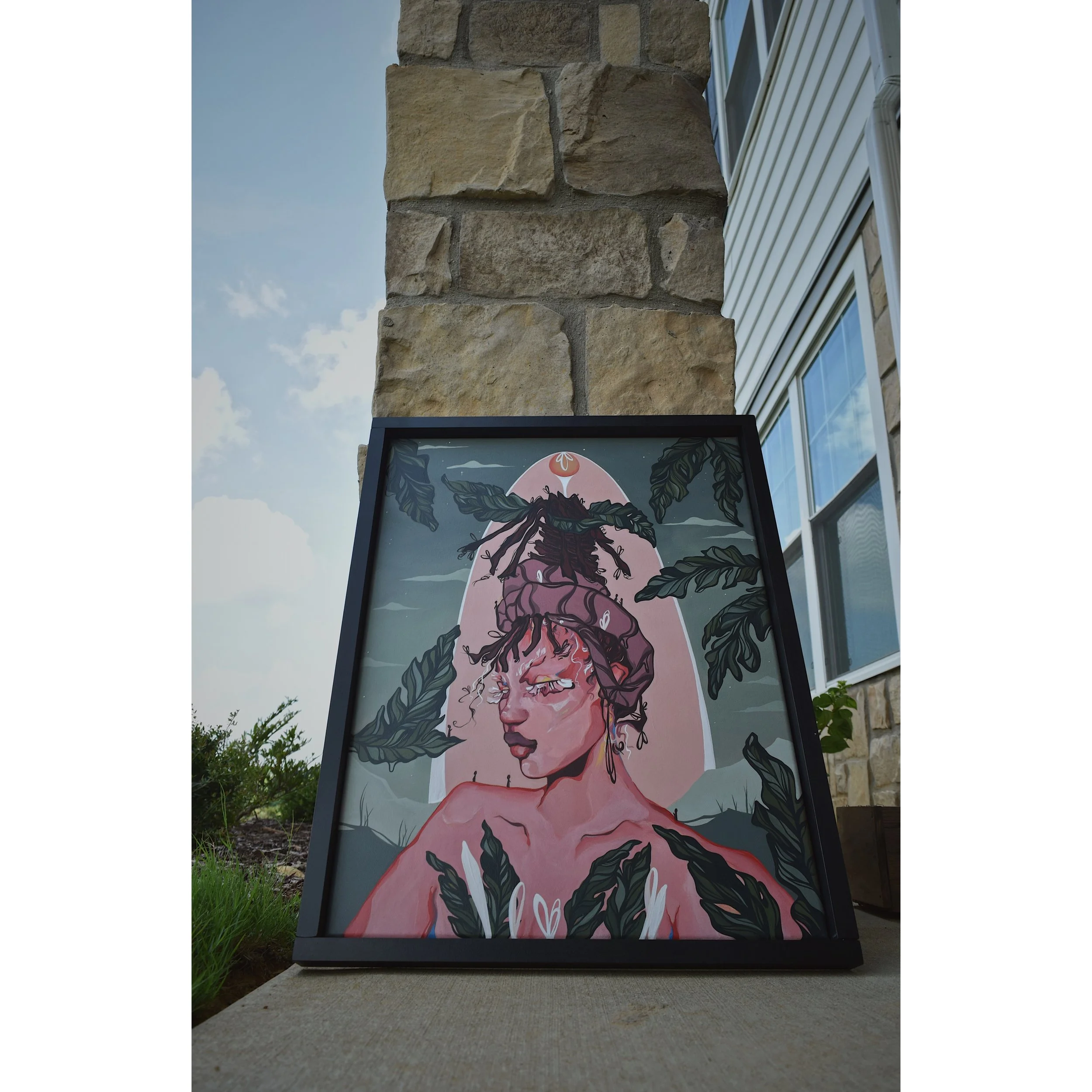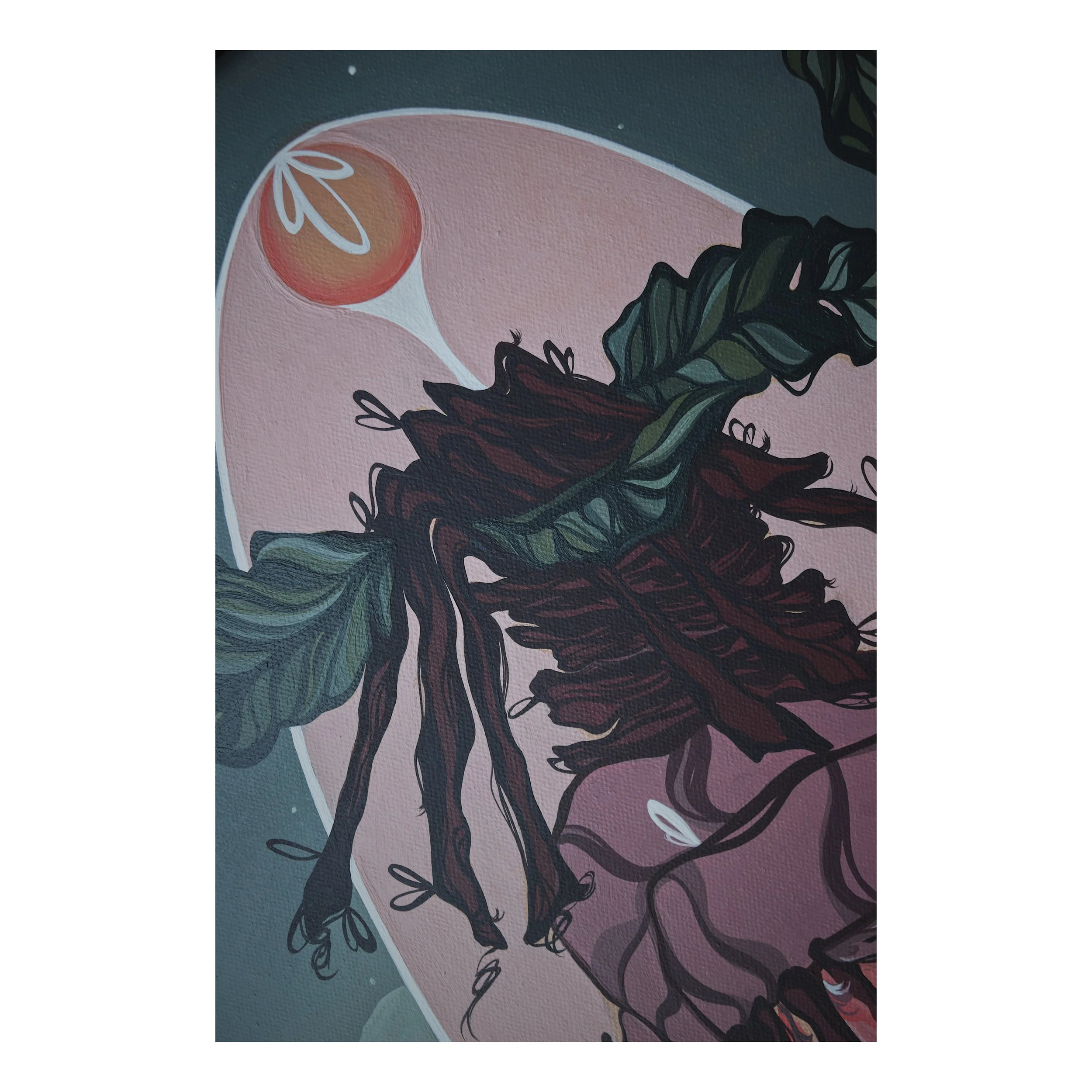 Paintings like my “Melody”, “Harmony” and Lush series definitely influenced the direction I took with this one. I wanted to capture a whimsical, serene background, while surrounding her with and making her one with the plants as my little silhouettes explore her world.