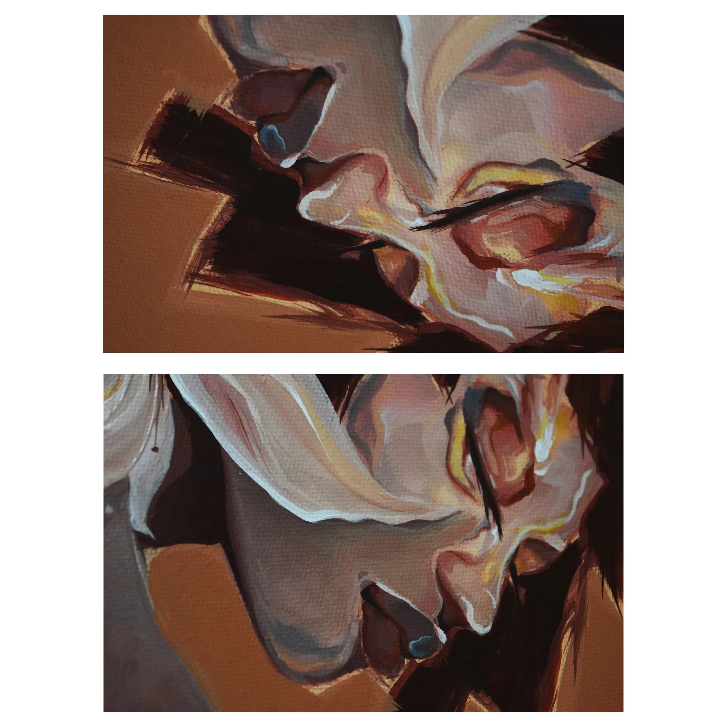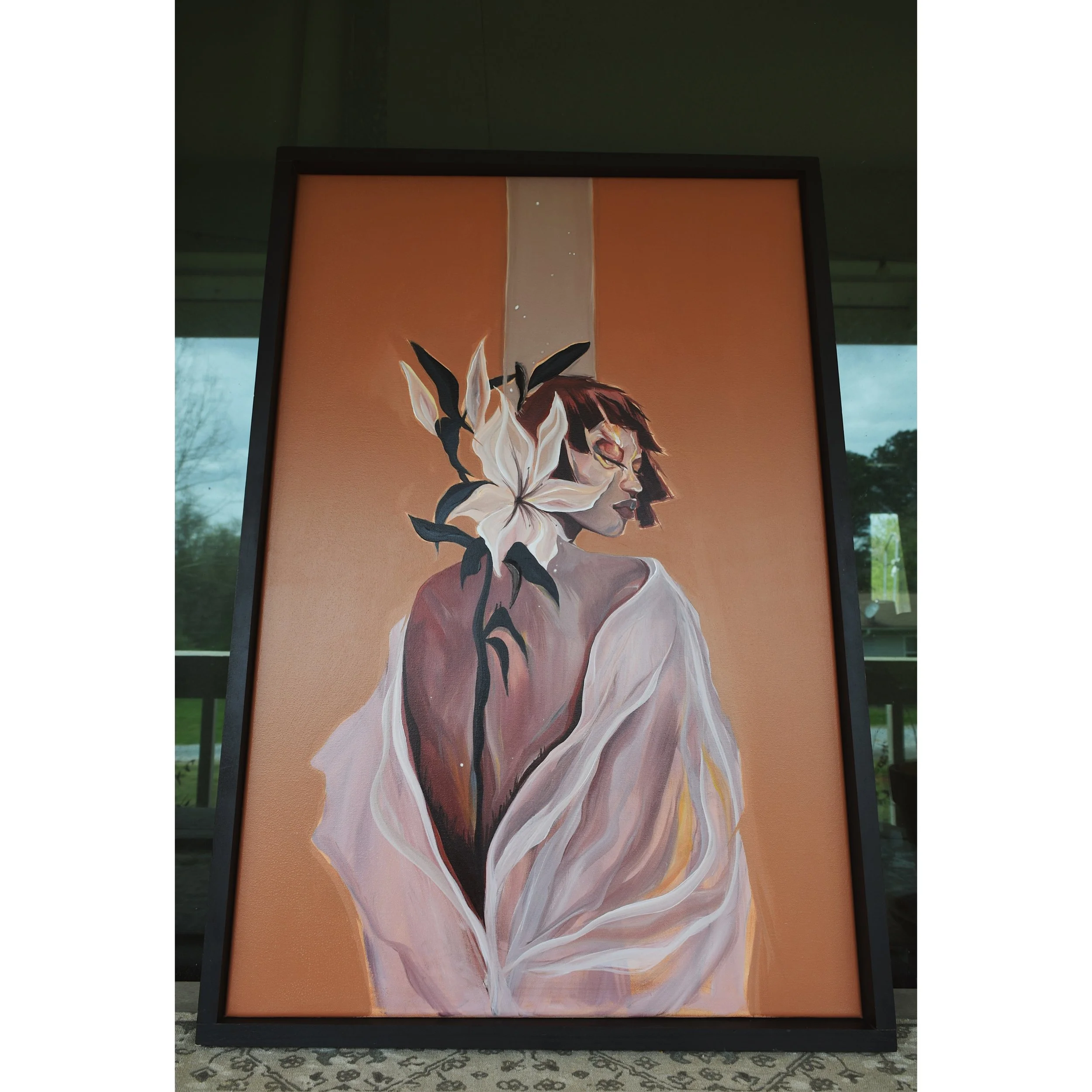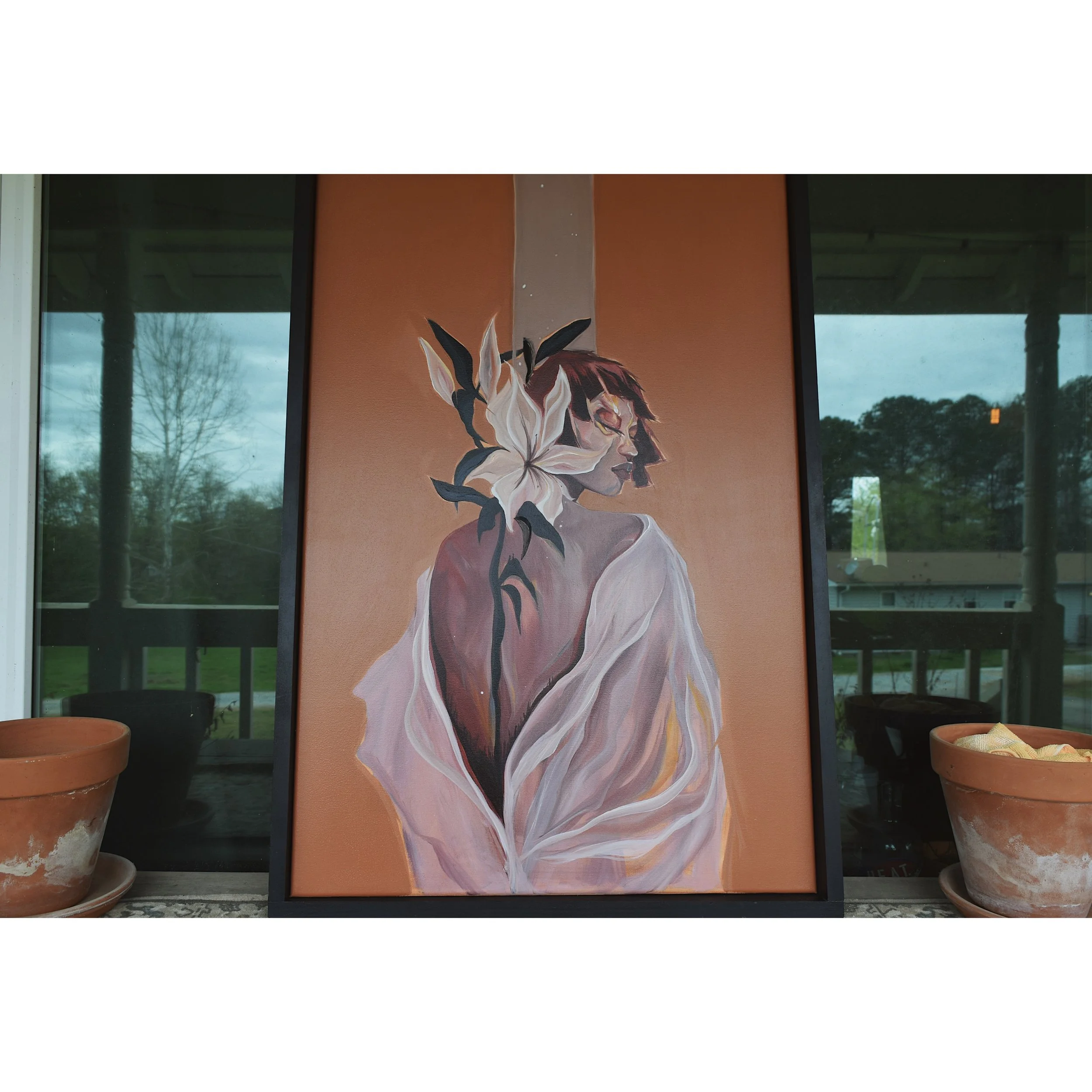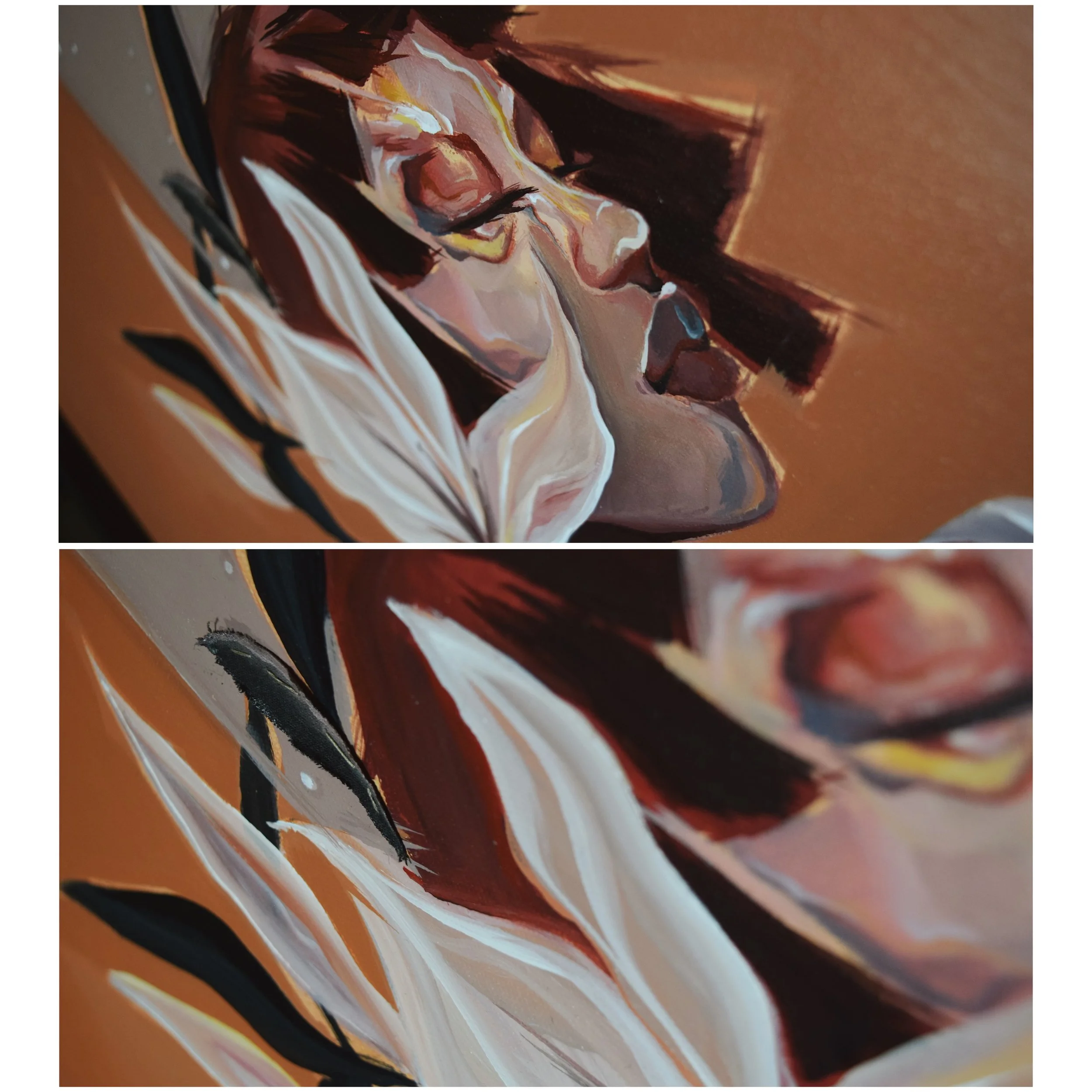 “Lily’s Valley” started as a live painting. I wanted to incorporate my long lost love for sewing. In this piece I implement layering and adding texture with needle and thread. I initially picked this touch back up with “Bystanders” and with this one, the fabrics I cut, painted and added were very subtle, as I'm still experimenting. I think it adds just the right amount of depth without clashing too much with the details/contrast in her skin/hair. Playing with the sky tones in her skin and human silhouettes throughout to create kind of an abstract valley was so fun and I’m excited to experiment even further with these touches in a future piece.
