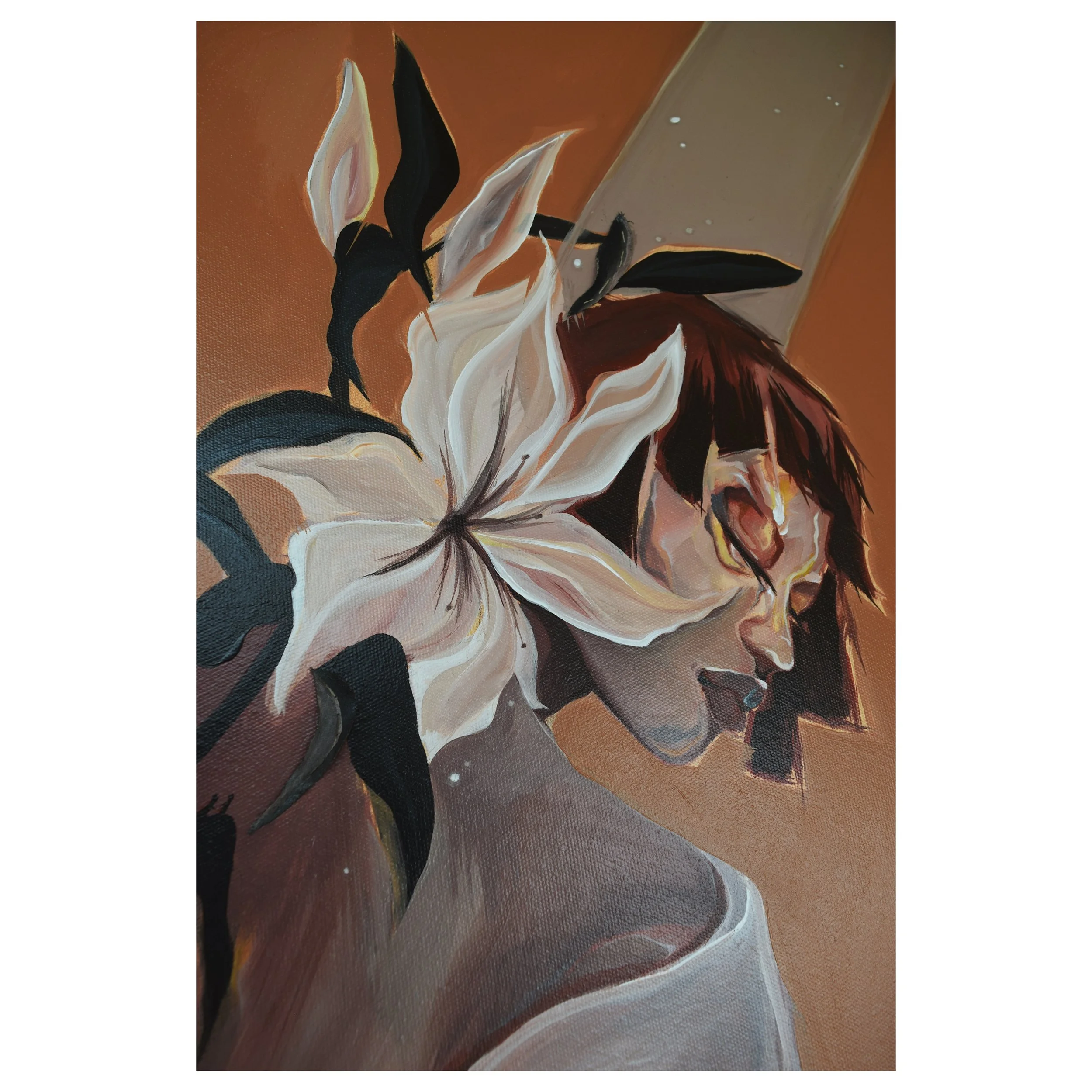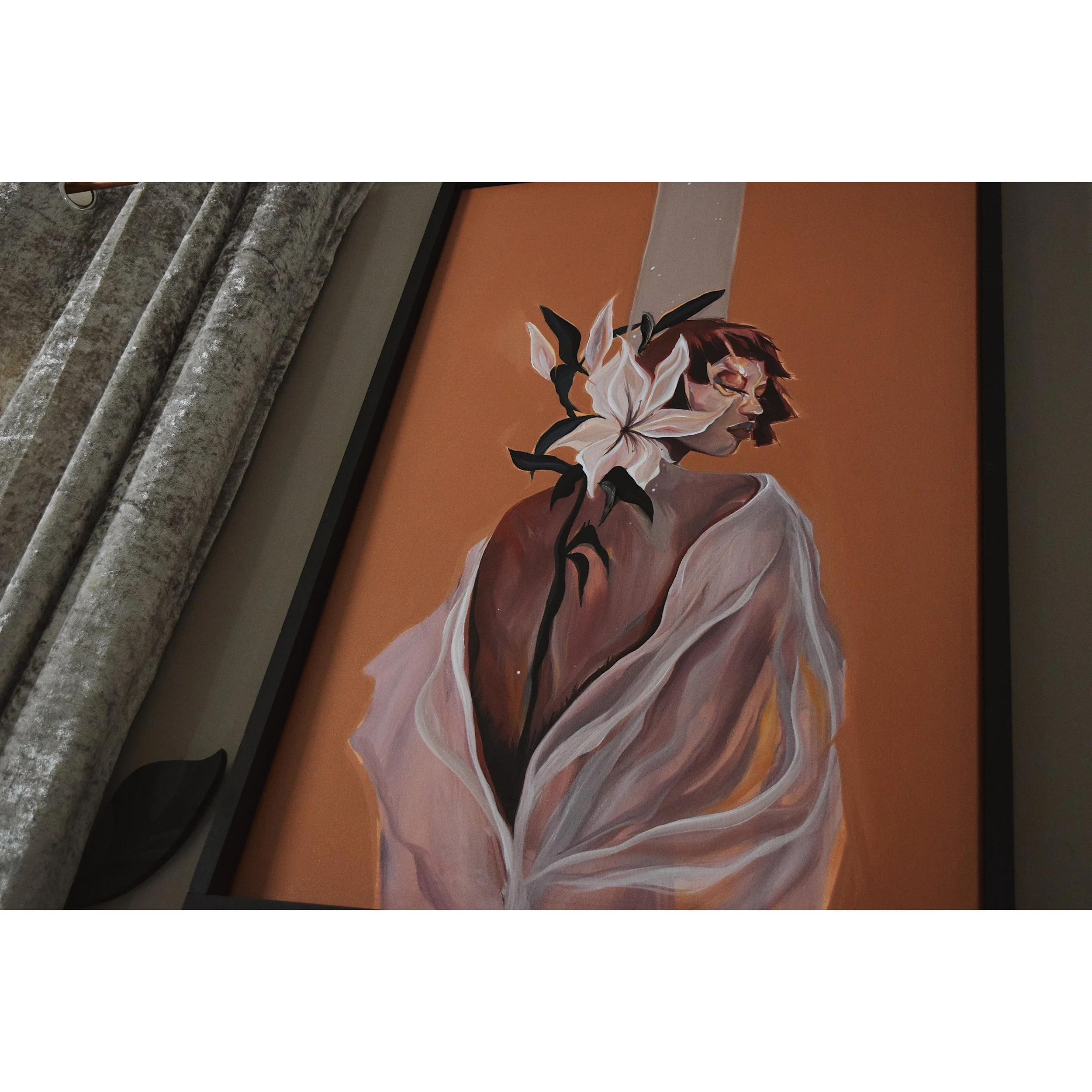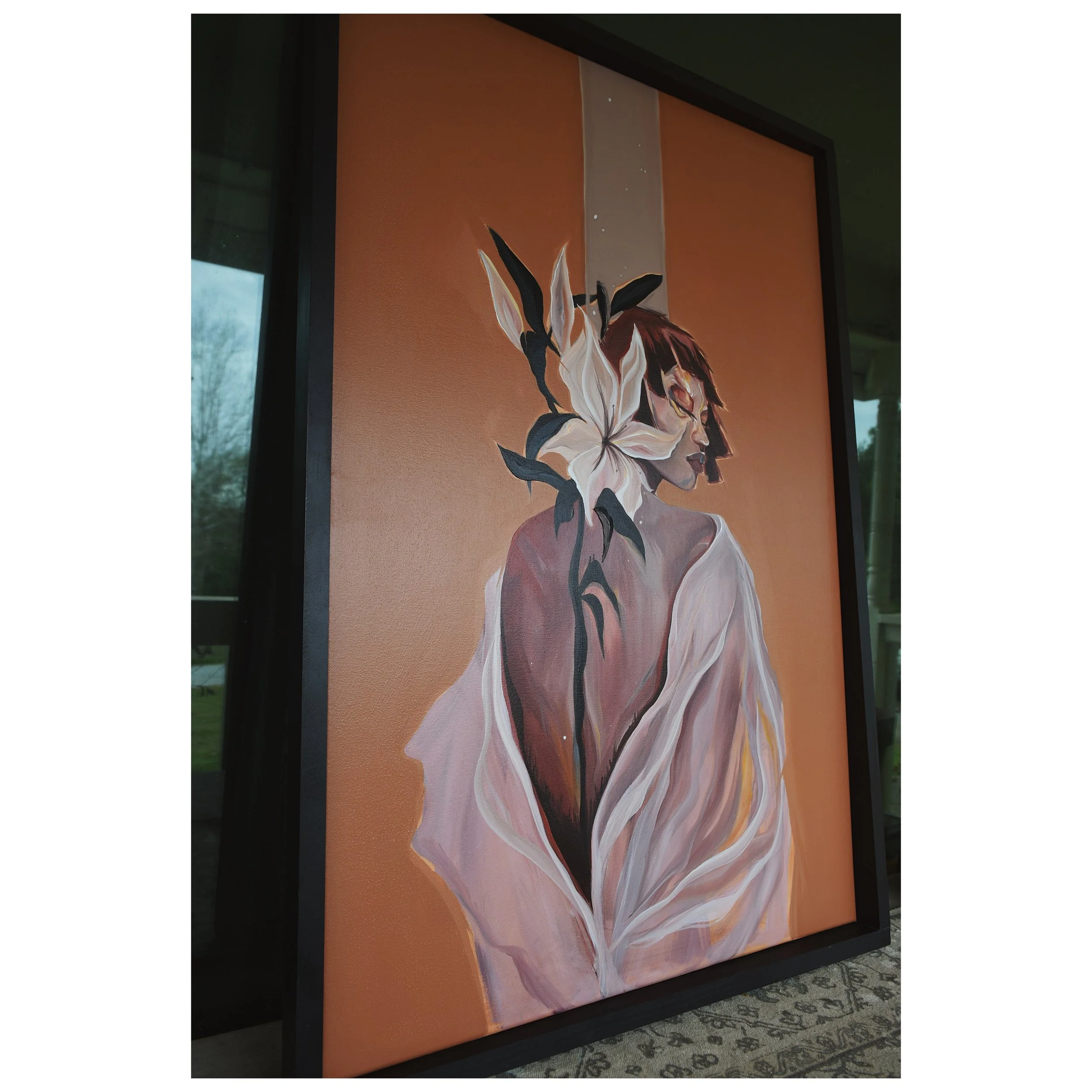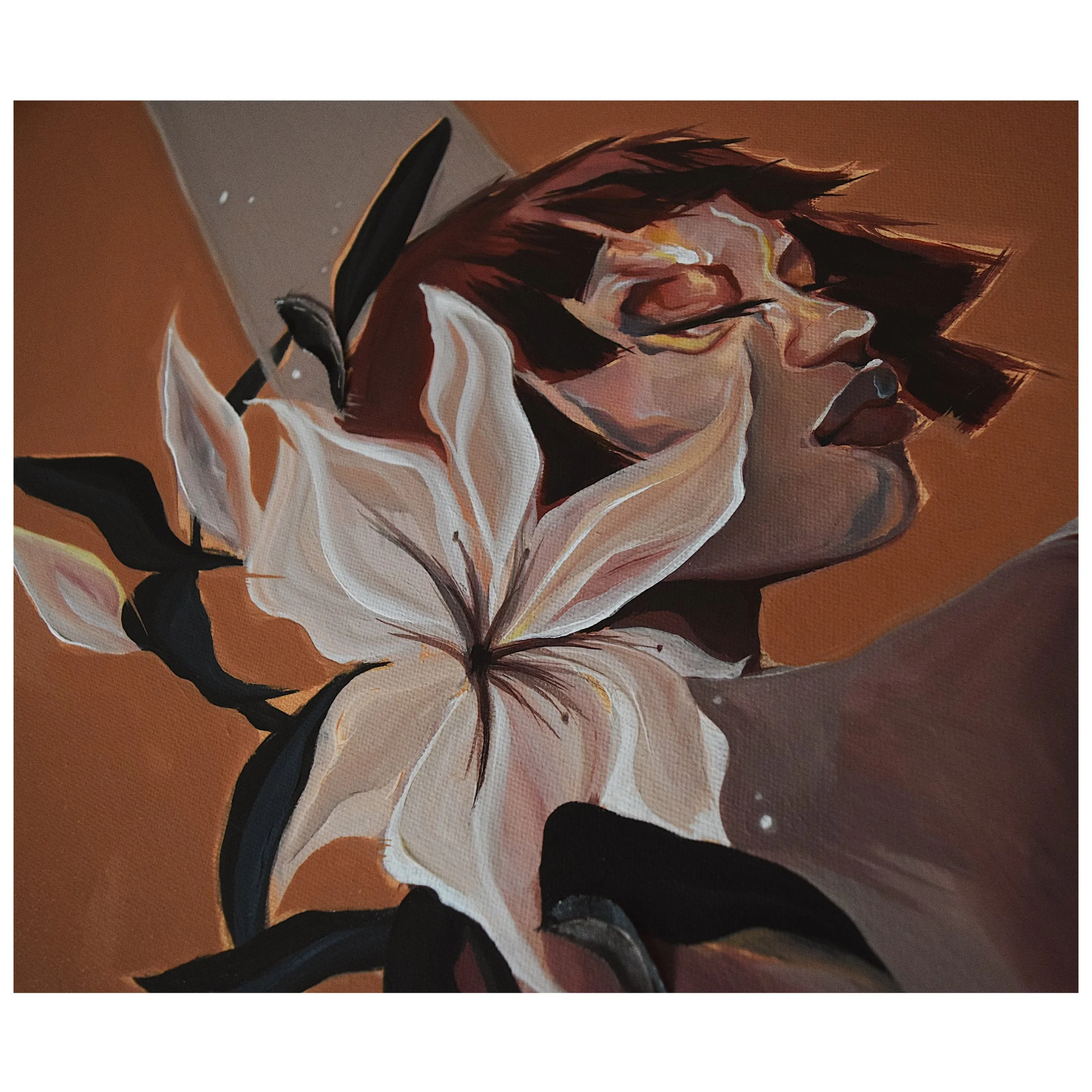 “Lily’s Valley” started as a live painting. I wanted to incorporate my long lost love for sewing. In this piece I implement layering and adding texture with needle and thread. I initially picked this touch back up with “Bystanders” and with this one, the fabrics I cut, painted and added were very subtle, as I'm still experimenting. I think it adds just the right amount of depth without clashing too much with the details/contrast in her skin/hair. Playing with the sky tones in her skin and human silhouettes throughout to create kind of an abstract valley was so fun and I’m excited to experiment even further with these touches in a future piece.